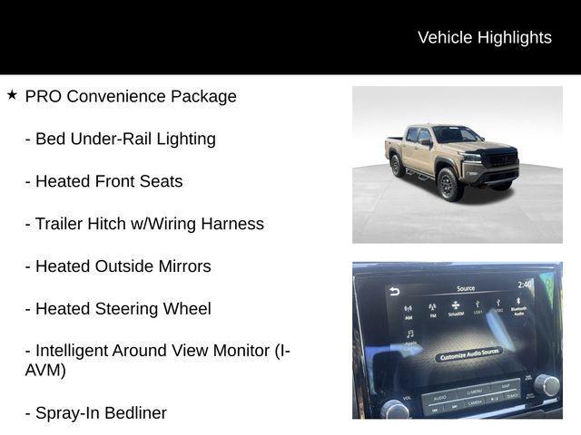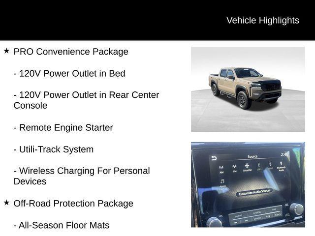 **$49,245 Original MSRP**, 4WD, PRO Convenience Package, PRO Premium Package, Technology Package, Off-Road Protection Package, Auto-Tilt & Slide Sunroof w/Manual Shade, 120V Power Outlet in Bed, 120V Power Outlet in Rear Center Console, 17 Accessory Dark Beadlock Style Alloy Wheels, All-Season Floor Mats, Auto-Dimming Mirror, Bed Under-Rail Lighting, Blind Spot Warning, Fender Premium Audio System w/10 Speakers, Front & Rear Leather Seat Trim (1st/2nd Rows), Heated Front Seats, Heated Outside Mirrors, Heated Steering Wheel, High Beam Assist (HBA), HomeLink UGDO, Intelligent Around View Monitor (I-AVM), Intelligent Cruise Control, Lane Departure Warning System, Partial Under-Seat Storage Delete, Rear Automatic Braking (RAB), Rear Cross Traffic Alert (RCTA), Rear Sonar System, Remote Engine Starter, Spray-In Bedliner, Tow Package (T11), Traffic Sign Recognition (TSR), Trailer Hitch w/Wiring Harness, Utili-Track System, Wireless Charging For Personal Devices. Baja Storm 2024 Nissan Frontier PRO-4X 4WD 9-Speed Automatic with Overdrive 3.8L DI DOHC 24V V6 Online price includes $1,000 in-house financing discount. If using outside financing or paying cash, price will increase by $1,000. Online price includes $1,000 trade-in assistance discount.
