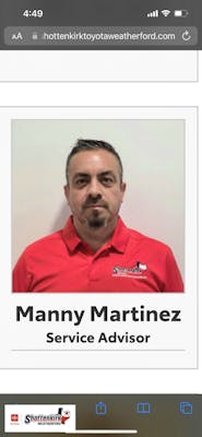 Manny was very professional and courteous. He kept me apprised of the services and the associated costs before the service and reviewed them after the service. I will continue to do my service He kept me apprised of the services and the associated costs before the service and reviewed them after the service. I will continue to do my service appointments with Manny Martinez and Shottenkirk Toyota Weatherford. More